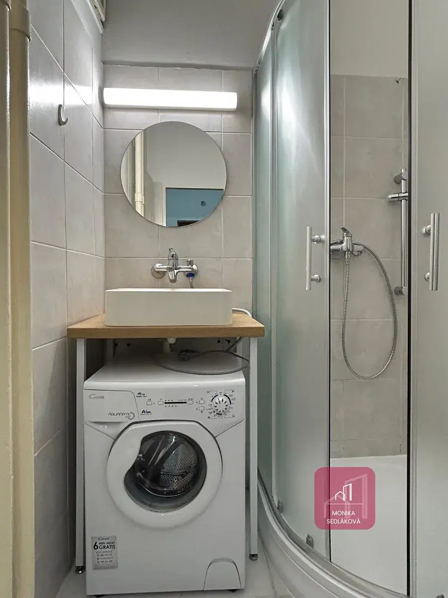 Dispozice bytu je prakticky řešena. Ze vstupní chodby s kuchyňskou linkou, můžete dále vstoupit do prostorného obývacího pokoje nebo do koupelny se samostatným WC. Byt se nabízí jako částečně vybavený. K dispozici je lednice, mikrovlnná trouba, pračka a varná deska.