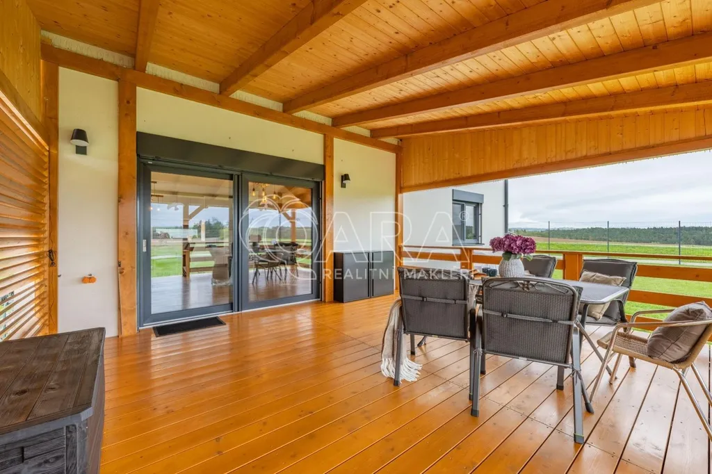 Dvoupodlažní rodinný dům o celkové ploše 136,9 m se rozkládá na pozemku o výměře 1851 m. Dům je dispozičně řešen jako 6+kk s přímo navazující terasou. Dům sestává z obývacího pokoje s kuchyňským koutem, pěti pokojů, technické místnosti, spíže, chodby, koupelny se sprchovým koutem a WC v prvním patře a koupelny s vanou, sprchovým koutem a WC ve druhém patře. Z pozemku je krásný výhled na les.