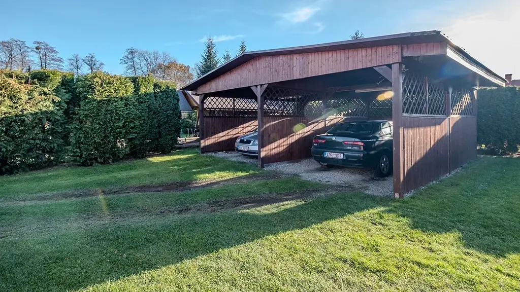 • Garáž s dílnou, kryté parkovací stání pro 2 auta (s elektřinou) a další nekryté parkování.