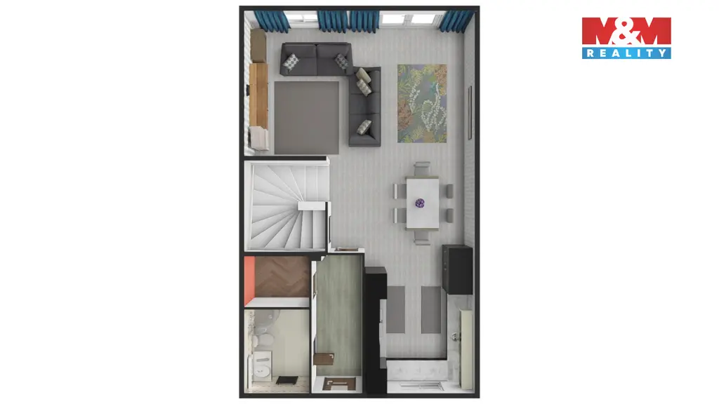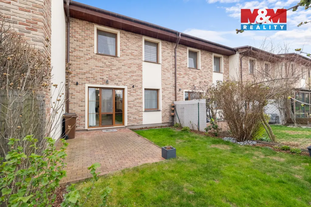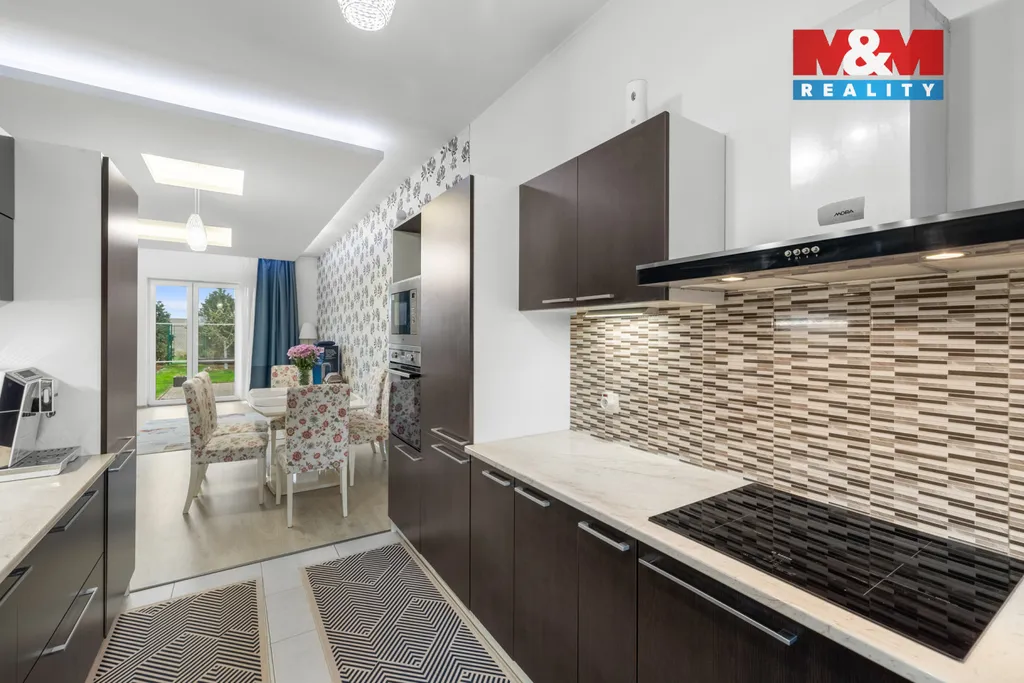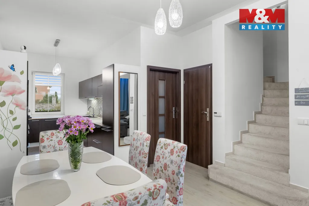 Dominantou domu je světlý obývací prostor s kuchyní a přímým vstupem na zahradu s ovocnými stromy, ideální pro relaxaci i rodinné chvíle.