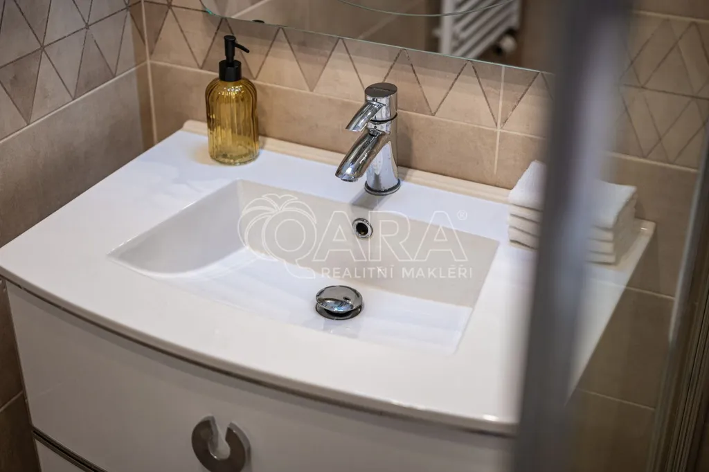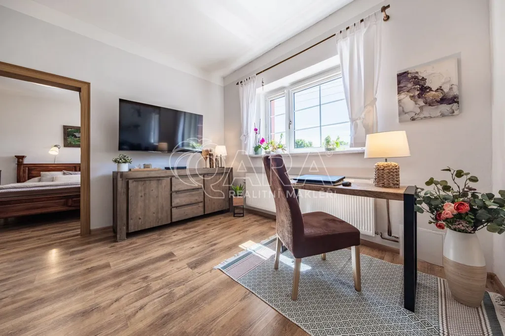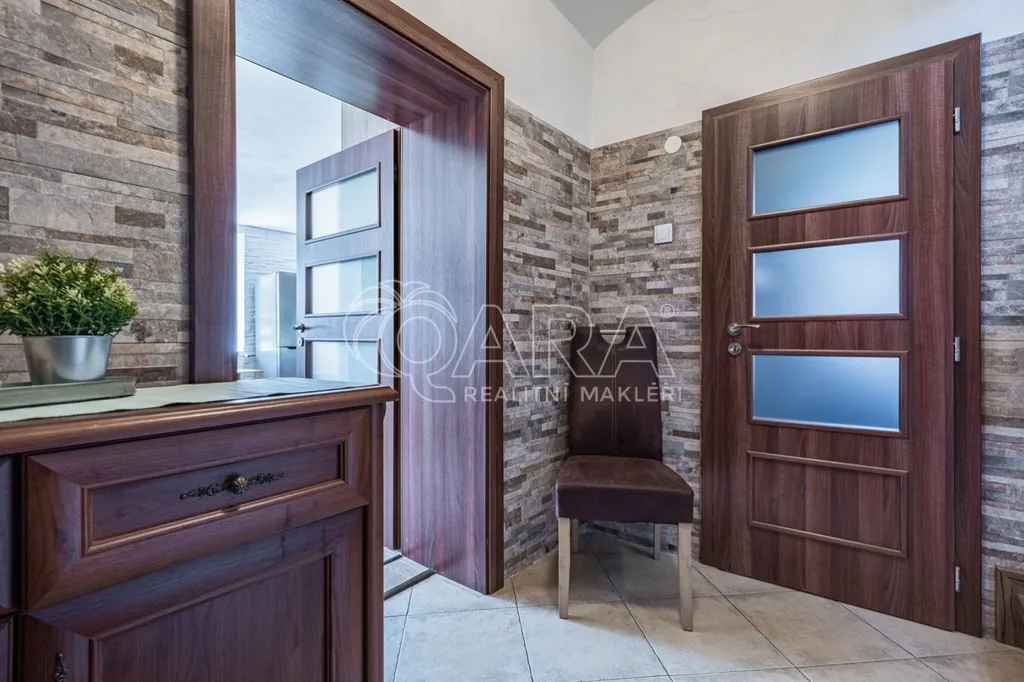 Do domu se vchází bývalým průjezdem, ze kterého je nyní uděláno prostorné garážové stání, takže pěkně suchou nožkou z domu do auta. Vjezd je opatřen novými elektrickými garážovými vraty se samostatným vstupem "pro pěší". Je zde umístěný Wallbox - nabíjecí stanice pro dvě elektroauta. Z průjezdu se vchází do přízemí domu nebo rovnou na zahradu. V přízemí je situován samostatný byt 1+kk, který je možno využít jako kancelář či máte-li odrostlejšího potomka a chce se cítit tak trochu samostatně, i zde je tato možnost, nebo pronájem. Byt je vybaven plně funkční kuchyňskou linkou, velkou a pohodlnou manželskou postelí s nočními stolky, komodou a TV, jídelním stolem a velkorysou šatní skříní na míru, prostornou koupelnou se sprchovým koutem a toaletou.
