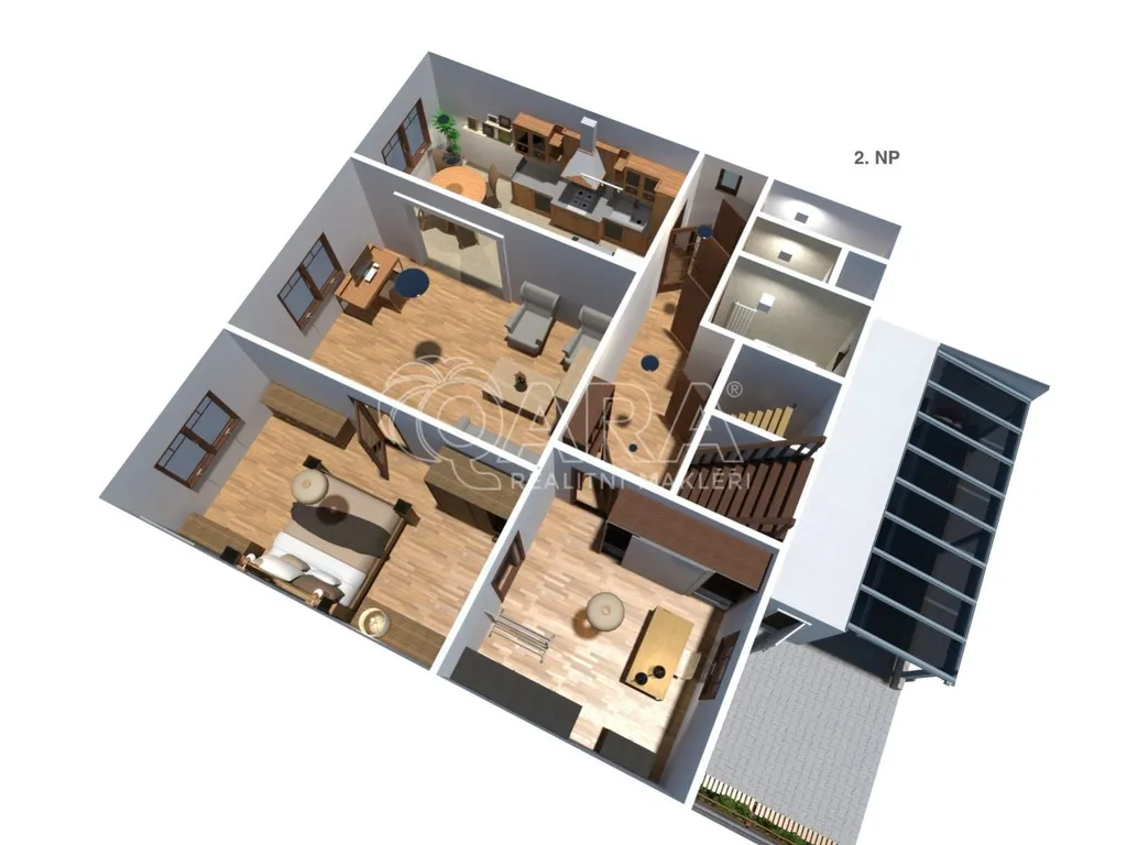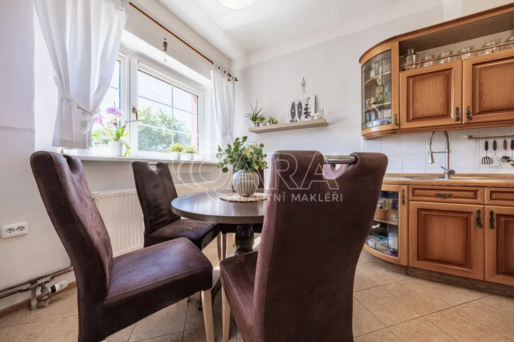 Dominantou horního podlaží je prostorný a světlý obývací pokoj decentně sladěný a propojený s kuchyní, také plně funkční, jídelním koutem a pracovním prostorem. Na obývací pokoj navazuje útulná vybavená ložnice, a další ložnice, která je nyní využívána jako šatna, tělocvična a pracovna paní domu.
