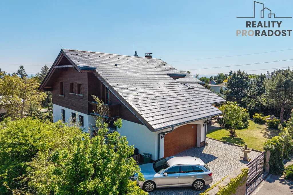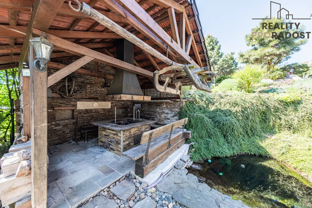 Kolem domu se rozprostírá udržovaná zahrada se vzrostlými stromy a keři, kde můžete trávit chvíle odpočinku. Naleznete zde zděný a zastřešený altán s centrálním grilem pro společné chvíle s přáteli. Na něj plynule navazuje zahradní jezírko. Neméně zajímavý pro Váš relax bude krytý bazén 7x3,5 m s protiproudem pro udržení fyzičky a velká terasa s výhledem do zeleně, kde můžete s rodinou trávit příjemné chvíle. Zavlažování zahrady zajišťují čtyři okruhy z retenční nádrže s obsahem 6 m3. Sekání trávníku za Vás zastane robotická sekačka.