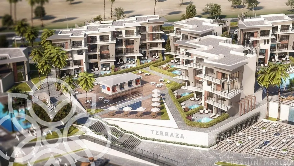 Byt 3+kk s terasou a zahrádkou nabízí dvě ložnice, obývací pokoj s kuchyňským koutem a koupelnu. Na přání lze vybudovat i soukromý bazén.