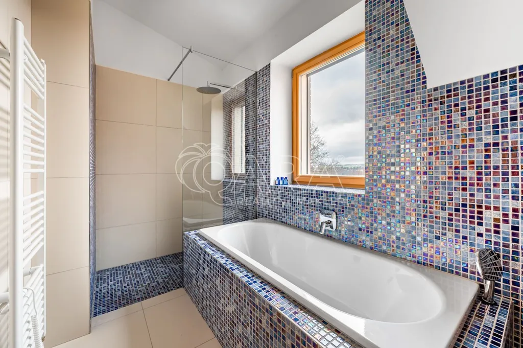 Vila disponuje prostorným přízemím, které nabízí elegantní kuchyň s obývacím pokojem a výstupem na jižní terasu, dále se zde nachází jeden pokoj, 2x šatna, 2x komora, koupelna a toaleta. V prvním patře najdete prostornou ložnici s terasou s nádherným výhledem, vlastní koupelnou se saunou. Další dva pokoje, koupelnu s vanou a sprchovým koutem a samostatnou toaletu. V suterénu domu je prádelna, dvě technické místnosti a sklad.