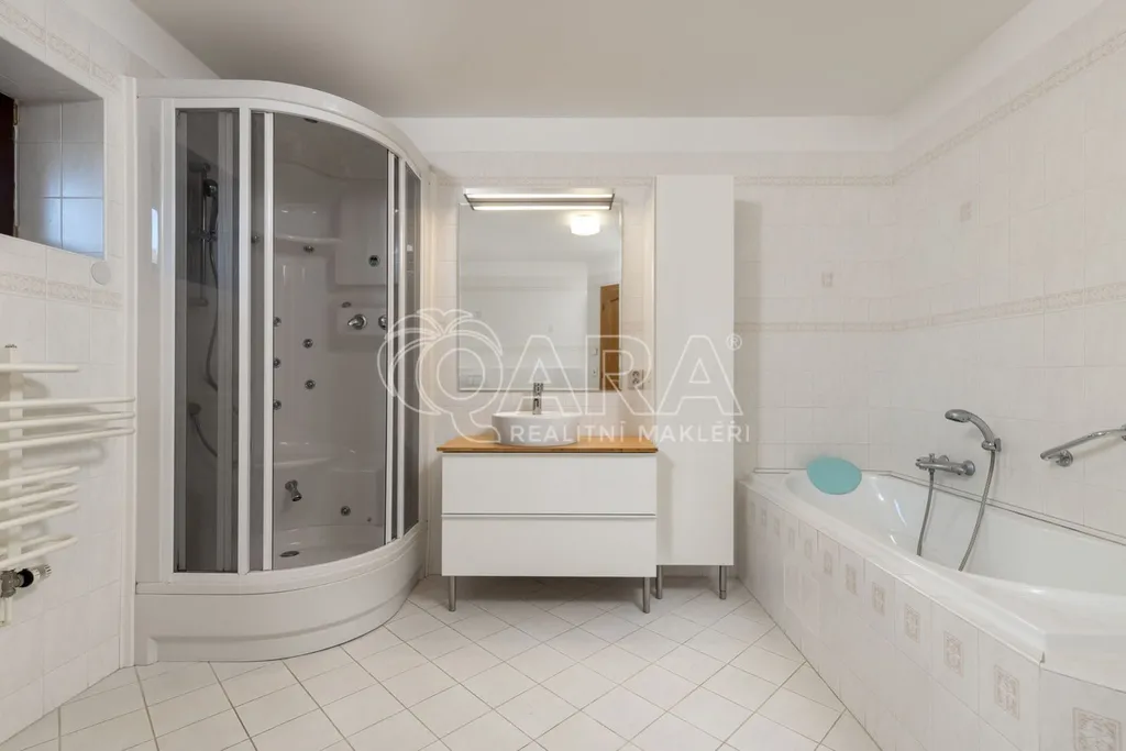 Dominantou domu je reprezentativně řešený obývací pokoj s krbem, propojený se zimní zahradou, jídelnou a kuchyní, doplněný galerií se schodištěm. Obytná část navazuje na terasu orientovanou do krajiny. Dispozice zahrnuje 7 samostatných ložnic, což umožňuje pohodlné rodinné i vícegenerační bydlení nebo kombinaci bydlení a práce z domova. Součástí domu je velkorysá knihovna s pracovnou, tělocvična, šatny, koupelny, rozsáhlé technické zázemí, dvojgaráž s přímým vstupem do domu, dílna, další samostatná garáž a domek pro zahradní techniku.