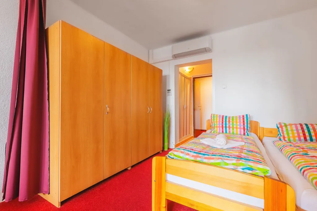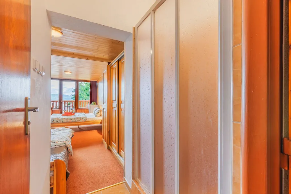 Stávající dispozice umožňuje ubytování až pro 64 hostů ve 15 stejných čtyřlůžkových pokojích, každý s vlastním sociálním zázemím a balkonem orientovaným do krajiny. Součástí areálu je také samostatný apartmán, který je nyní využíván pro personál, ale lze jej jednoduše upravit pro další hosty. Celková užitná plocha objektu přesahuje 1 200 m, parkovací plocha pojme přibližně 20 automobilů a celý areál působí čistě, udržovaně a připraveně k provozu.