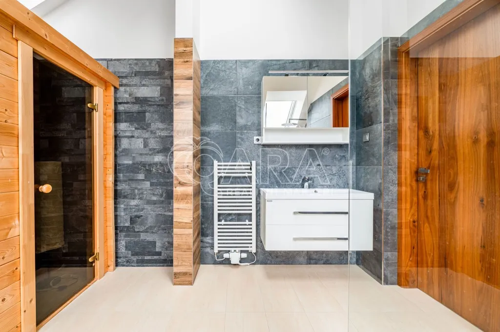 V prvním patře je umístěna další prostorná kancelář s terasou a nádherným výhledem, vlastní koupelnou se saunou, dále dvě samostatné neprůchozí kanceláře, koupelna s vanou a sprchovým koutem a samostatná toaleta.