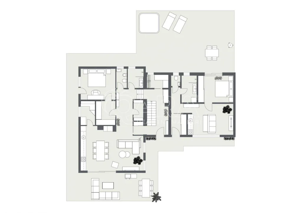 Součástí nemovitosti je také druhá samostatná jednotka s vlastním vstupem ze zahrady. Dispozice 2kk nabízí obývací pokoj s kuchyňským koutem, samostatný pokoj s přímým vstupem na vlastní terasu, koupelnu a oddělenou toaletu. Jednotka je ideální např. pro management, zázemí firmy či samostatnou kancelář.
