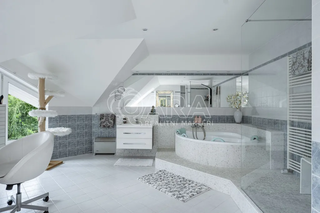 V klidné vilové části obce se nachází dům s plochou 540 m, situovaný na pozemku o celkové výměře 1 749 m, z toho 1 487 m tvoří parkově upravená zahrada, která poskytuje maximální soukromí a prostor pro relaxaci i společenská setkání.