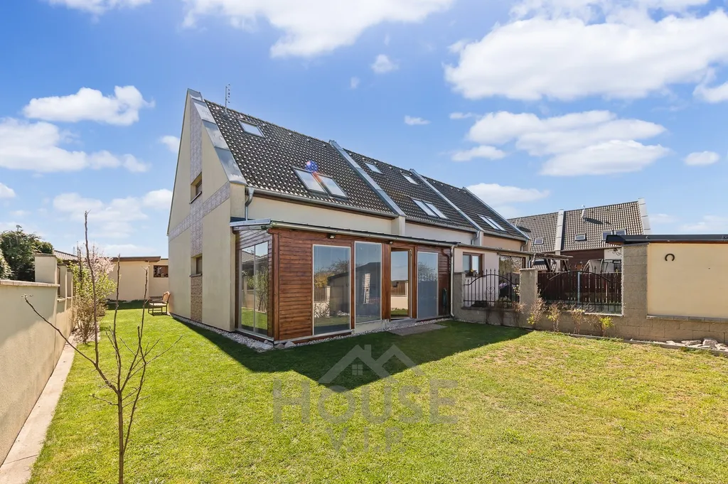 K domu náleží garáž pro dvě auta, zahradní domek a příjemná zahrada, která poskytuje dostatek soukromí i prostoru pro odpočinek či volnočasové aktivity.