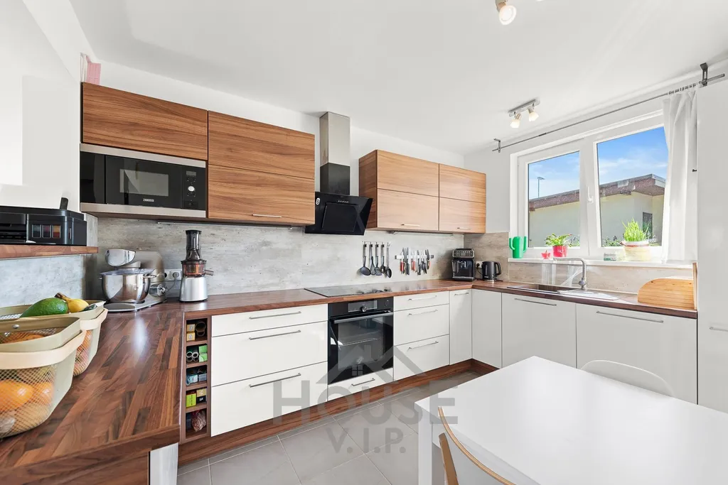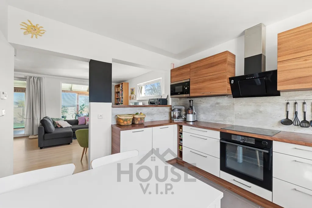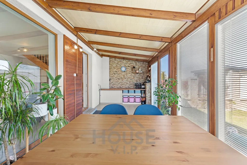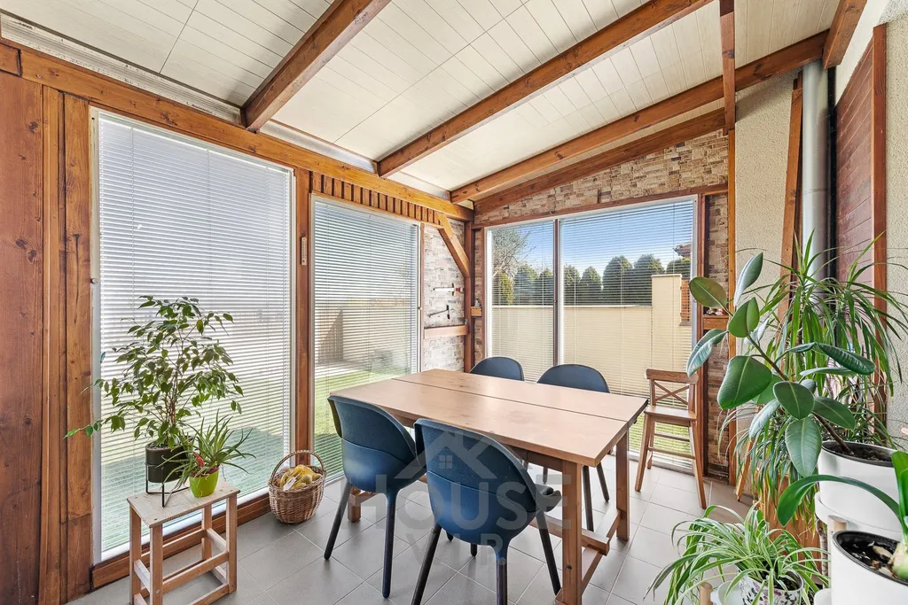 V přízemí se nachází obytná část s podlahovým vytápěním, které zajišťuje příjemné teplo a pohodlí během celého roku. Součástí domu je také zimní zahrada (17 m2) s přímým vstupem na zahradu, která poskytuje ideální místo pro relaxaci i posezení s rodinou či přáteli.