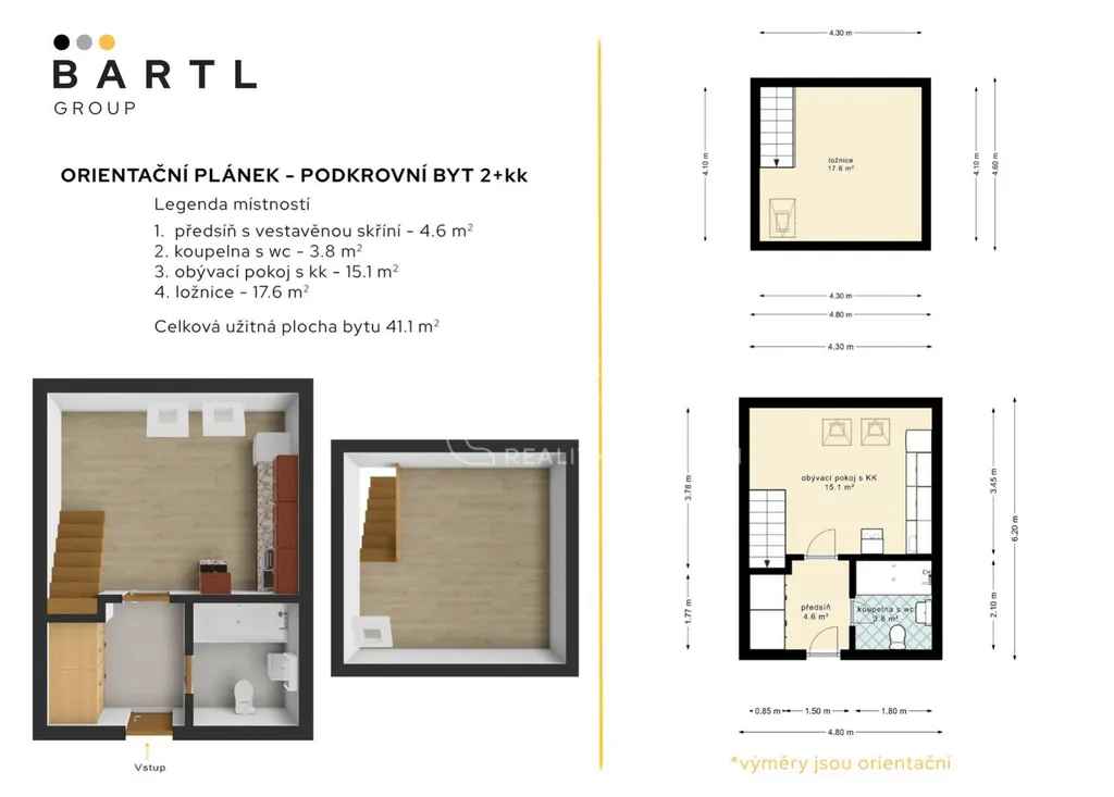 Dispozice bytu je řešena jako mezonet, což jej výrazně odlišuje od běžné nabídky menších bytů. Spodní část tvoří vstupní předsíň s prostornou vestavěnou skříní, obytný prostor s kuchyňským koutem a koupelna s vanou a WC. Do horního patra, kde se nachází samostatná ložnice, vedou dřevěné schody. Podkrovní provedení s přiznanými dřevěnými trámy dodává interiéru osobitý charakter a příjemnou atmosféru. Díky umístění v podkroví působí byt velmi světlým a vzdušným dojmem.