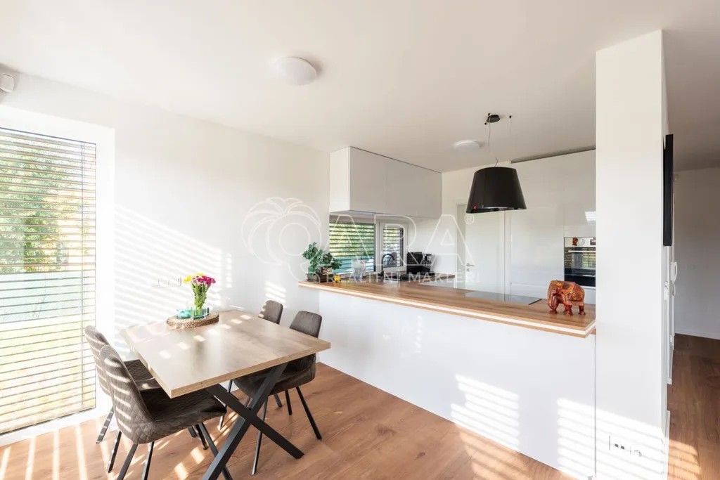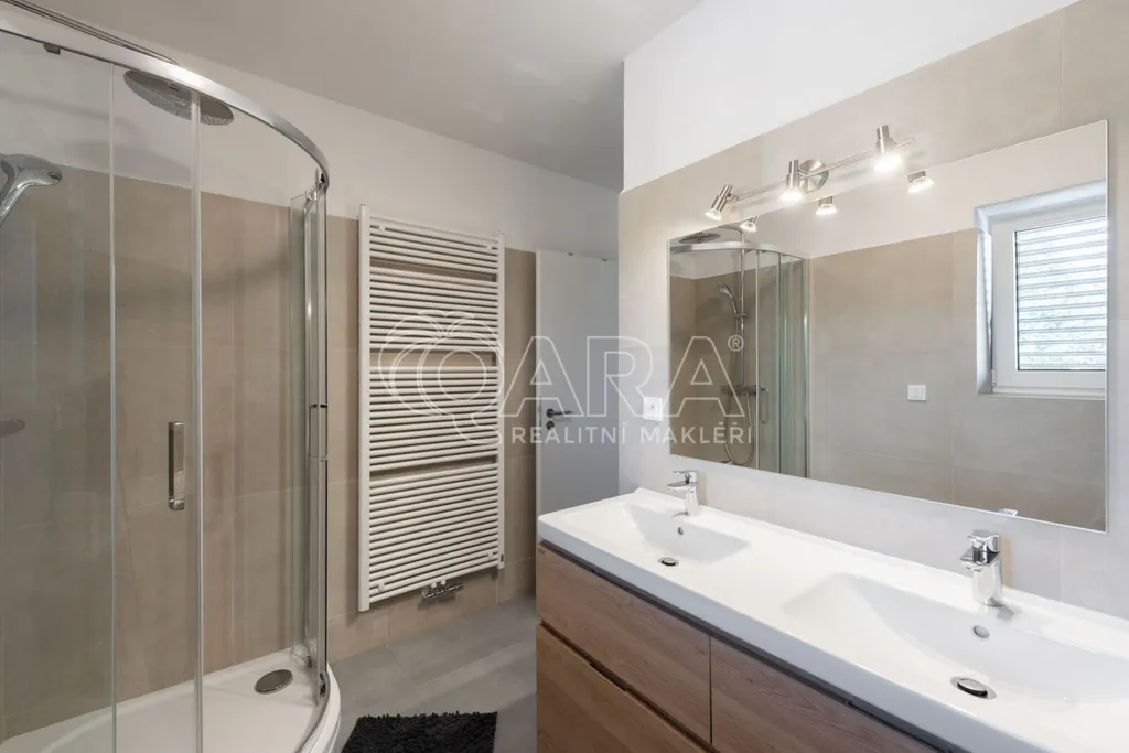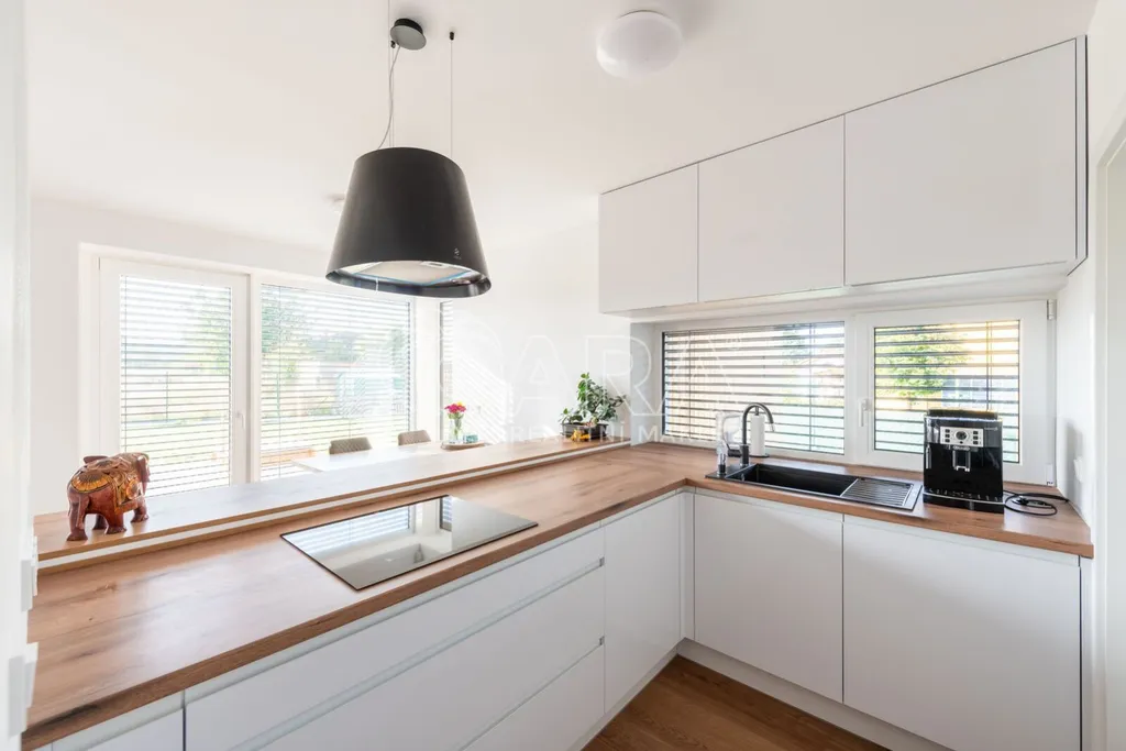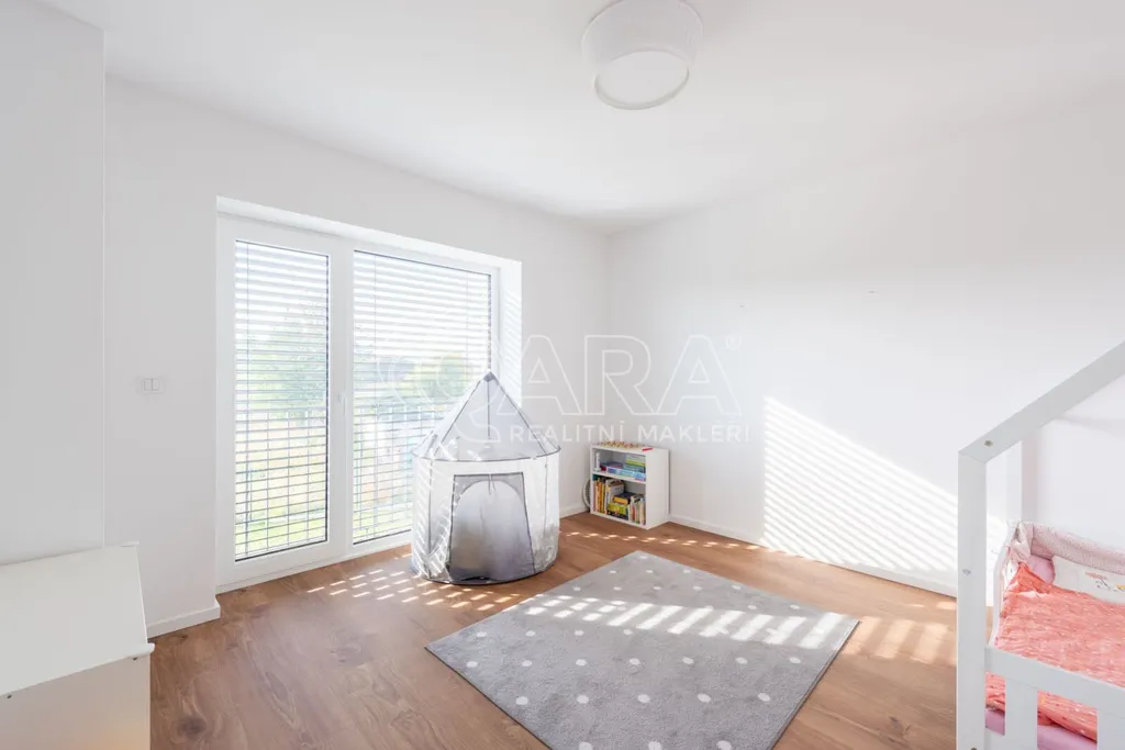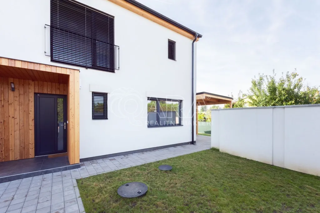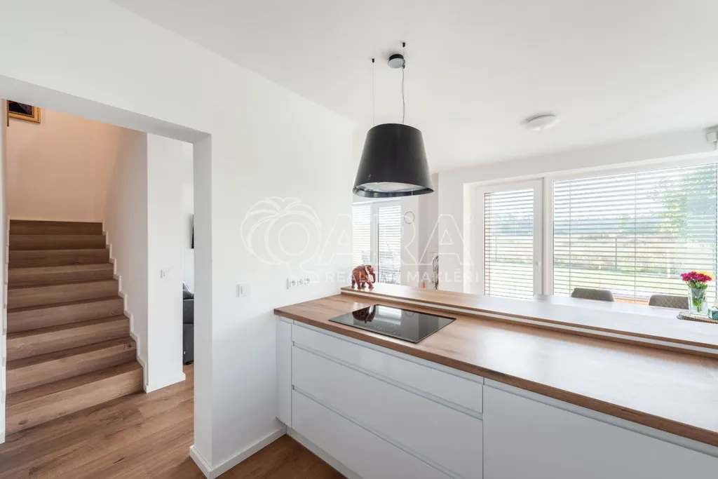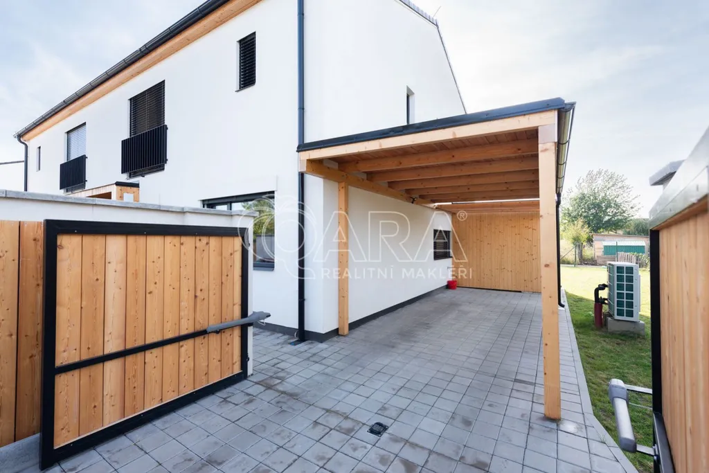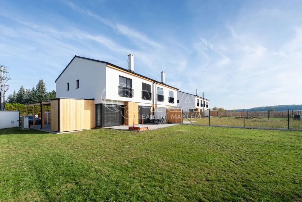 Nabízím k prodeji novostavbu rodinného domu 5+kk (polovinu dvojdomu) z roku 2022. Jedná se o kvalitní zateplenou zděnou stavbu s podlahovým vytápěním napojeným na tepelné čerpadlo (voda-vzduch). Dům je umístěn v klidné okrajové části obce. Na pozemku se nachází zastřešené parkovací stání s navazujícím zahradním domkem o velikosti 5,5 m2.
