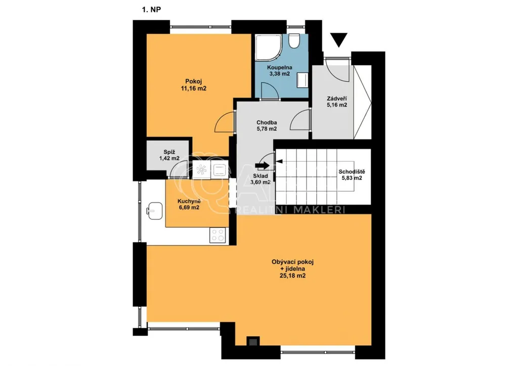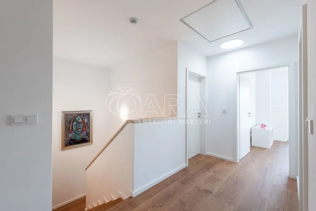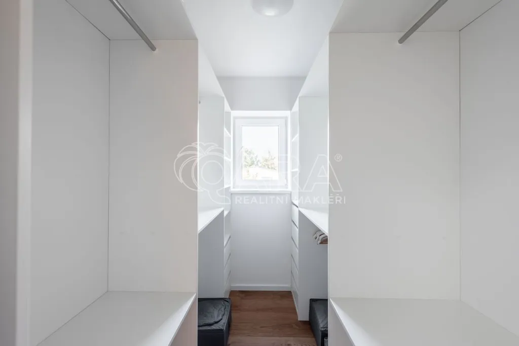 Dům má velmi praktickou dispozici s dostatkem úložných prostor. V přízemí domu se nachází vstupní chodba s vestavěnou skříní, prostorný, jižně orientovaný obývací pokoj s jídelnou se vstupem na vydlážděnou terasu, dále kuchyň a spíž, pokoj o výměře 11 m (může sloužit jako pracovna nebo pokoj pro hosty) a dále koupelna se sprchovým koutem a toaletou. Kuchyň byla dělaná na míru od společnosti Sykora. Samozřejmostí jsou kvalitní vestavěné spotřebiče značky Electrolux - indukční varná deska, myčka, elektrická trouba, lednice s mrazákem a digestoř značky Elica. Dalším úložným prostorem v přízemí je komora pod schodištěm. V patře se pak nacházejí tři prostorné pokoje, každý o výměře 13 m, šatna s úložným prostorem dělaným na míru, technická místnost s přípojkami na pračku a sušičku s další toaletou, a větší koupelna s dvojumyvadlem, vanou a sprchovým koutem. Výklopným schodištěm je přístupný pochozí půdní prostor vhodný pro ukládání sezónních věci.