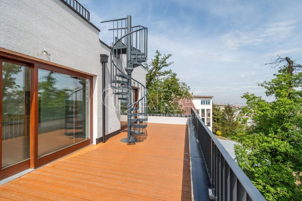 Avšak ta pravá kouzla se začínají dít o patro výš. Obývací pokoj, který je synonymem pro velkorysost a eleganci, se otevírá na terasu o rozloze 30 m2 s výhledem, který bere dech. Zde, nad korunami stromů, máte panoramatický výhled na Prahu a její okolí, což je zážitek, který se nikdy neomrzí. A pak je tu střešní terasa o ploše 50m2, vaše soukromá oáza pro relaxaci, zábavu nebo jednoduše pro chvíle klidu s rodinou. Na straně jedné s Prahou jako na dlani a zelení přírodního parku na straně druhé.