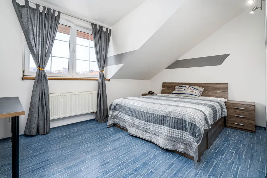 Dispozice nabízí prostorný obývací pokoj s výškou stropu 4,5 m, jídelní část, samostatný kuchyňský kout s vestavnými spotřebiči, dvě ložnice na hlavní úrovni, koupelnu s rohovou vanou a samostatné WC. Po schodišti se dostanete do patra, kde se nachází další ložnice a pracovna.