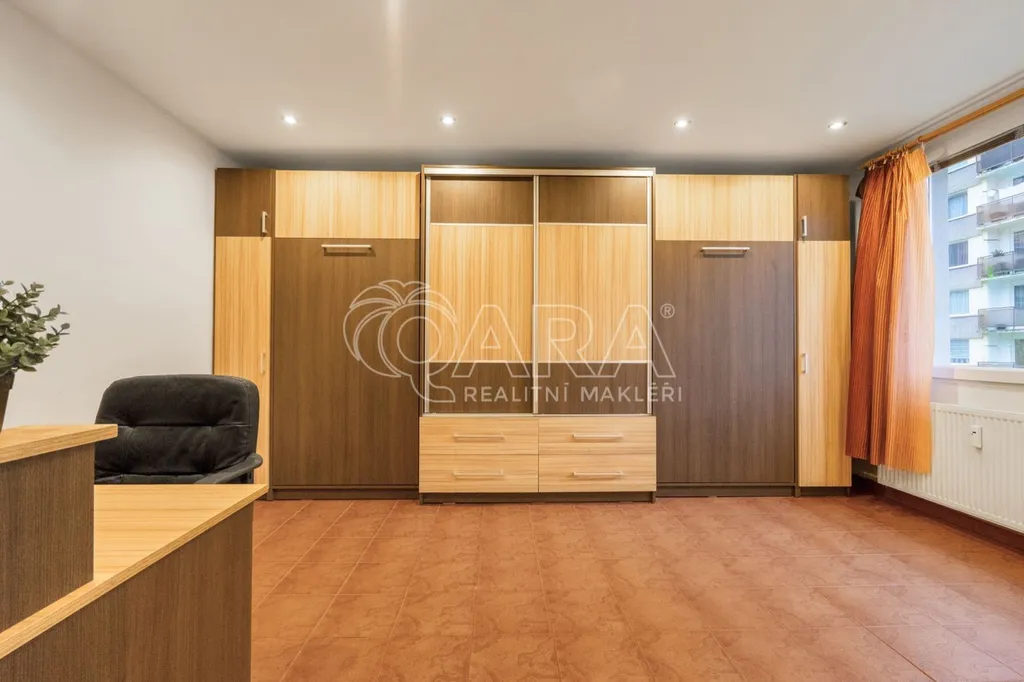 Bytová jednotka prošla kompletní rekonstrukcí, v pokoji jsou na míru zhotovené skříně se zabudovanými sklopnými lůžky a ve stejném stylu i pracovní stůl.
