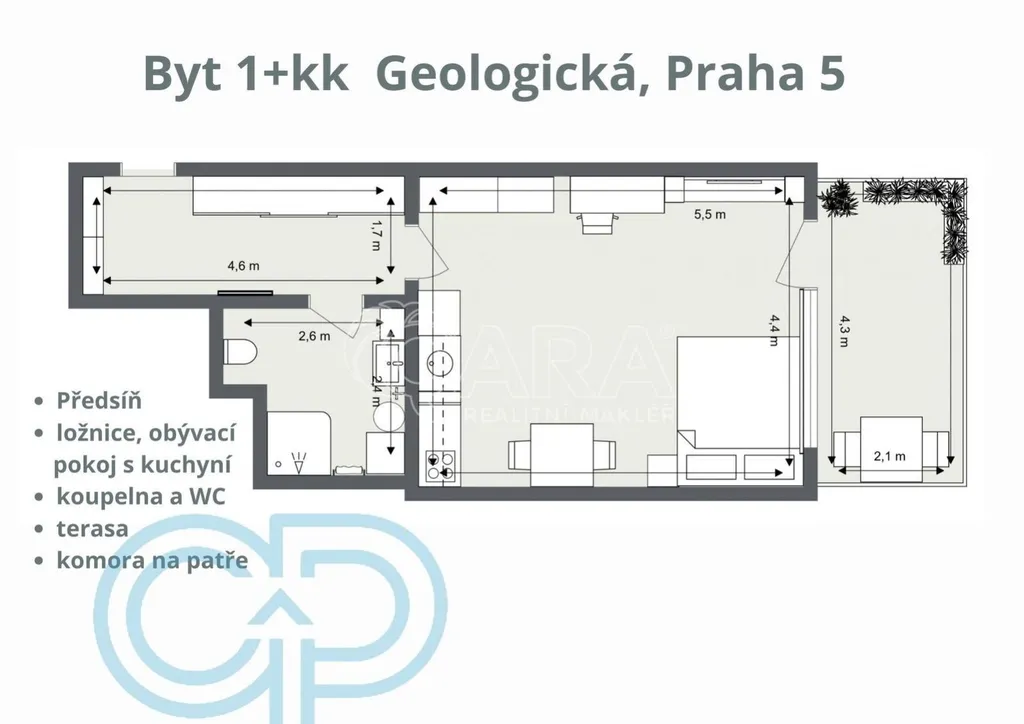 V zastoupení vlastníků nabízím k prodeji velmi příjemný byt o dispozici 1+kk (39,6 m) s terasou 9m2 orientovanou do dvora. Nachází se v ulici Geologická, uprostřed klidné a vyhledávané části pražského Barrandova. Byt se nachází v rezidenčním projektu z roku 2012.