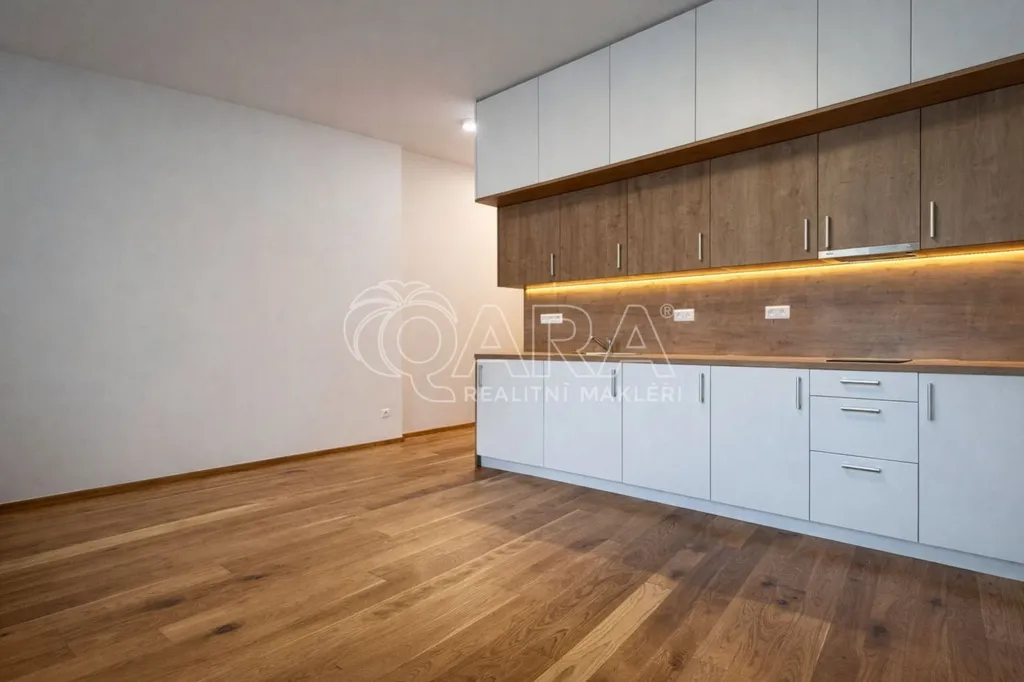 Interiér nabízí kvalitní materiály, jako jsou dřevěné podlahy a velkoformátová dlažba. Byt je vybaven moderní kuchyňskou linkou, obývací částí, koupelnou s vanou, toaletou a vstupní chodbou s úložným prostorem.