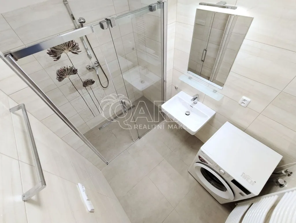 Tento byt má výborně řešenou dispozici danou dvěma neprůchozími ložnicemi vybavenými šikovně vestavěnými šatními skříněmi a samostatný prostorný obývací pokoj s navazujícím kuchyňským koutem. Ten je vybaven kuchyňskou linkou, ve které nechybí ani chladnička s mrazničkou a myčka nádobí. Koupelna disponuje širokým walk-in sprchovým koutem, WC je umístěno samostatně. Součásti vybavení je rovněž pračka.