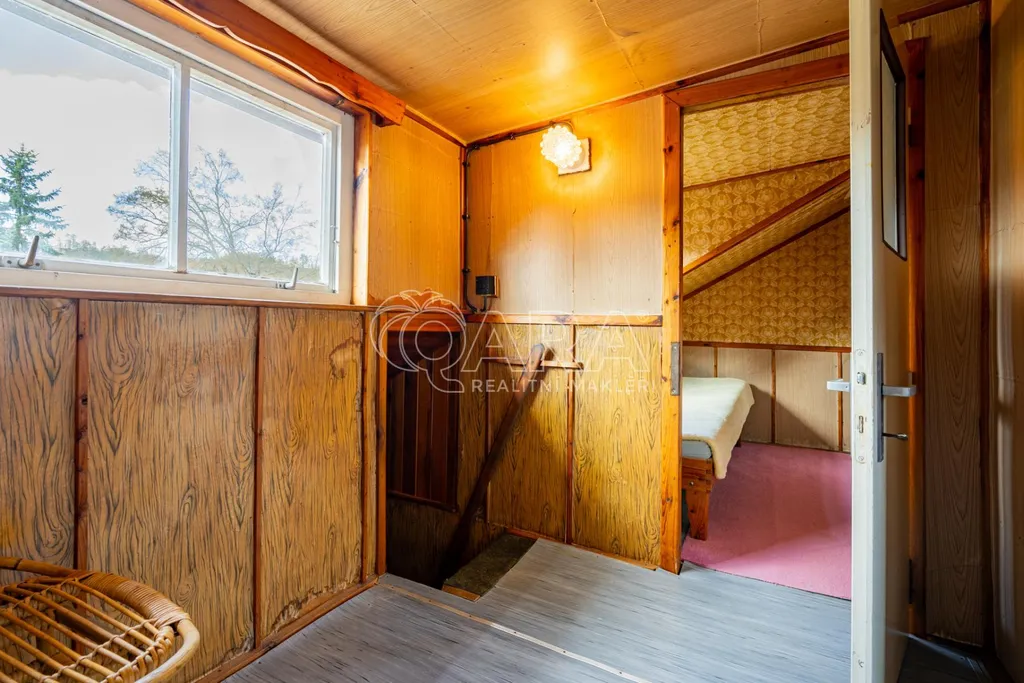 Přízemí: Veranda, chodba, koupelna (sprchový kout), umyvadlo, samostatná toaleta. Dále kuchyně, obývací pokoj a další pokoj osazený krbovými kamny na dřevo, která svou kapacitou stačí na vytopení celé chaty v jarním a podzimním období.