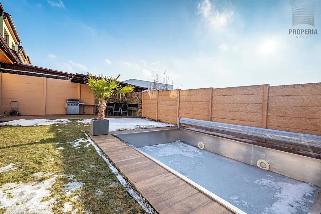 Jedním z hlavních benefitů této nemovitosti je jižně orientovaná zahrada, která nabízí skutečný pocit soukromí a relaxu. Najdete zde elegantní altánek s posezením a grilem, nerezový bazén s invertorovým čerpadlem umožňujícím ohřev i chlazení vody a především samostatný wellness domek se saunou, zázemím a WC, plně napojený na vodu, elektřinu i kanalizaci.