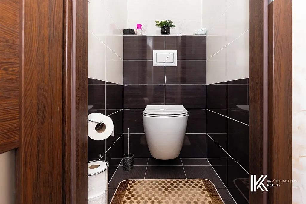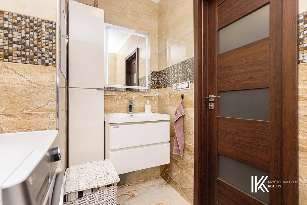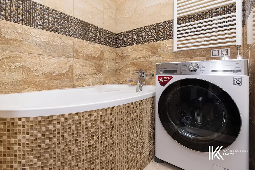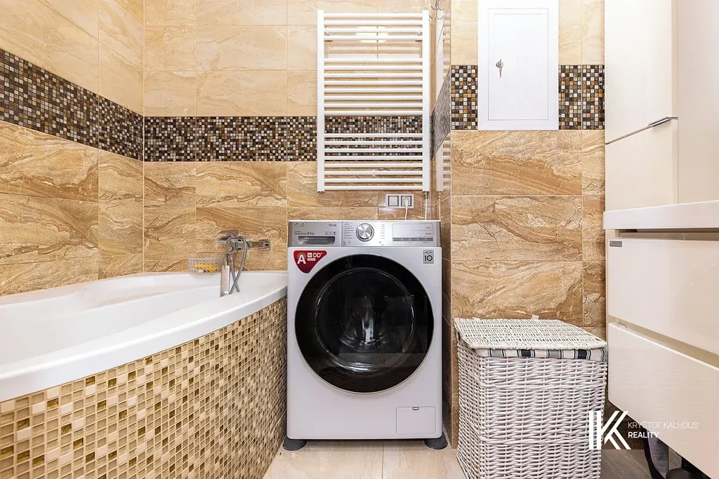 Koupelna je vybavena vanou, umyvadlem se skříňkami a pračkou. Další úložné prostory nabízí velká šatní skříň ve vstupní chodbě.