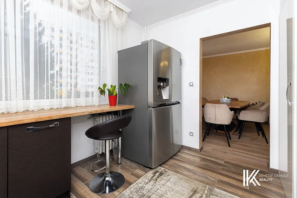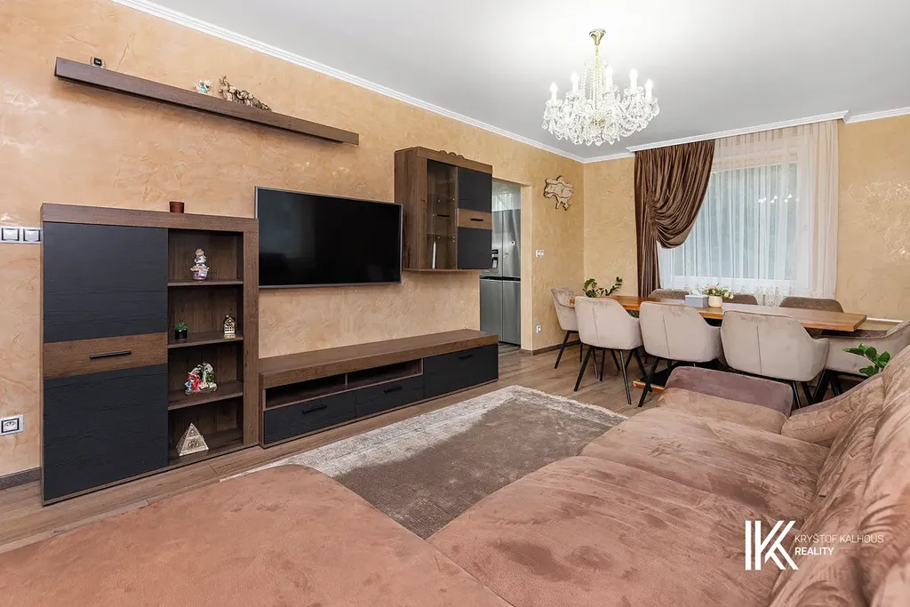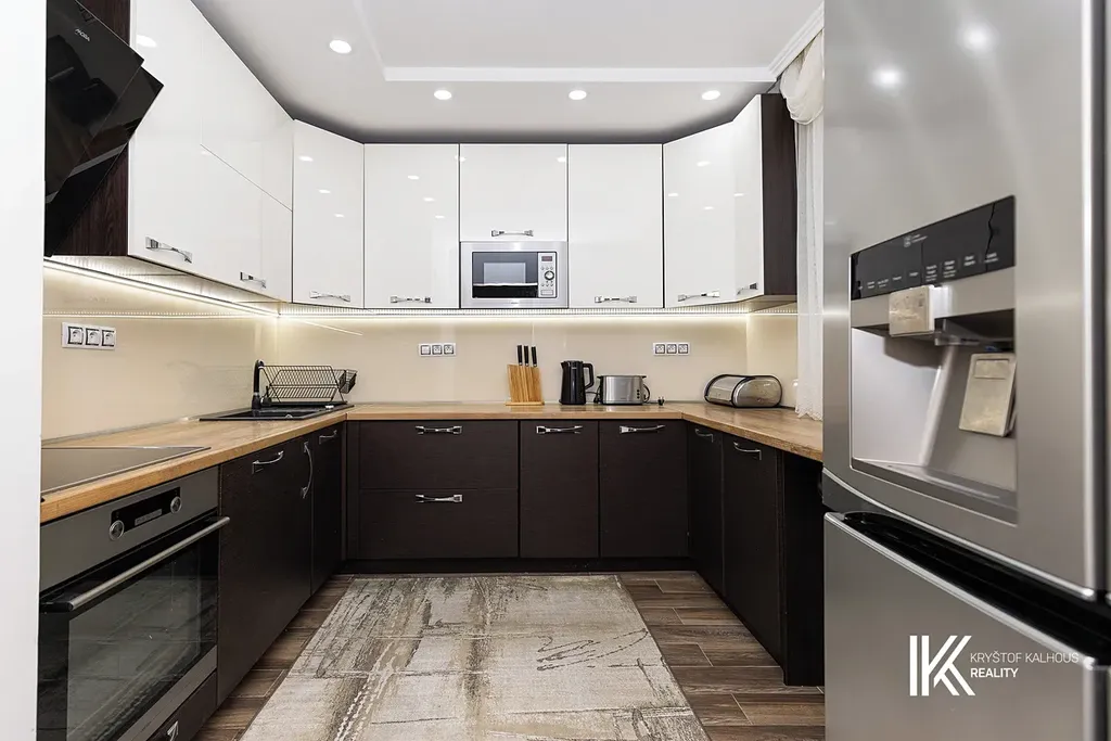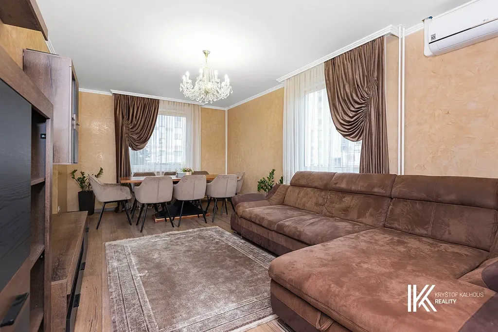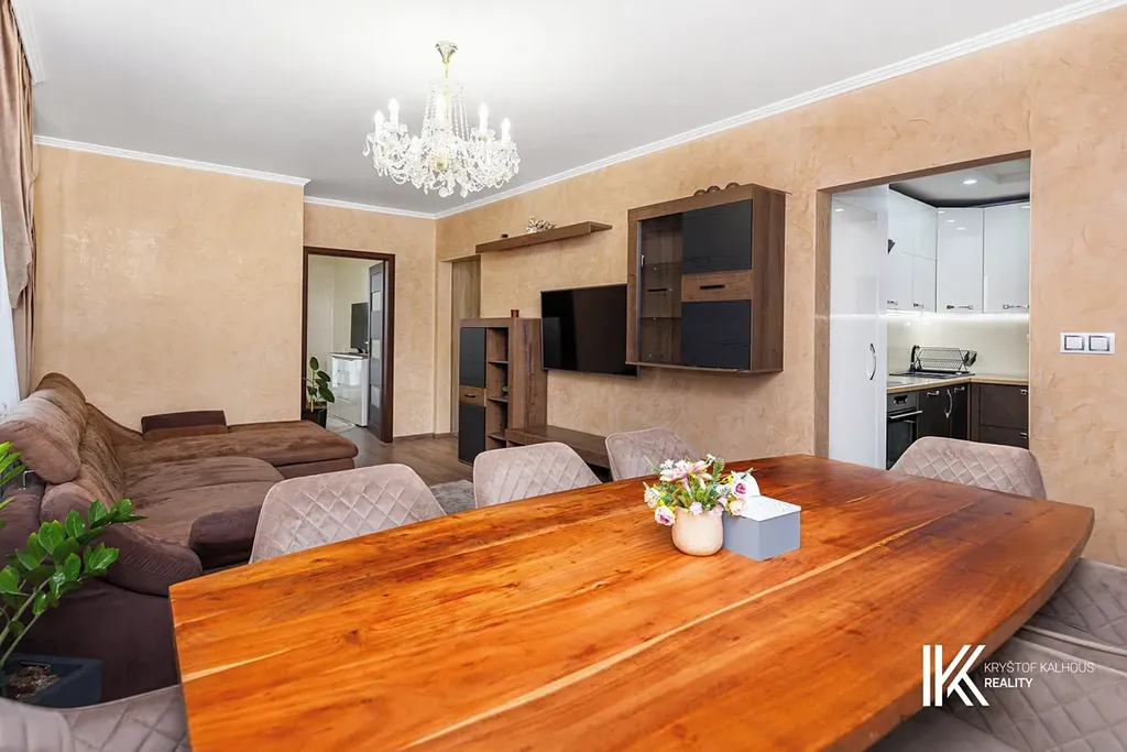 Dominantou bytu je velký obývací pokoj, který je prakticky rozdělen na jídelní část s velkým jídelním stolem a odpočinkovou zónu s pohodlnou pohovkou a televizí. Pro maximální komfort je zde instalována klimatizace. Na obývací pokoj navazuje samostatná kuchyně s prostornou kuchyňskou linkou ve tvaru písmene U. Ta nabízí dostatek pracovní i úložné plochy a je vybavena vestavěnými spotřebiči – troubou, indukční varnou deskou, digestoří, myčkou i mikrovlnnou troubou. Nechybí ani velká dvoudveřová americká lednice.
