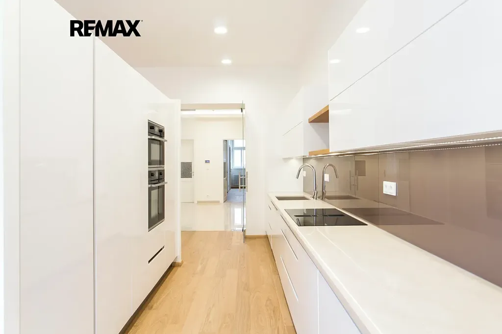 Byt prošel kompletní a důkladnou rekonstrukcí v roce 2020 s důrazem na kvalitu, detail a nadčasový design. Nová okna instalovaná v letošním roce přispívají k ještě vyššímu komfortu bydlení. Interiér kombinuje stylové dřevěné podlahy s designovými obklady a dlažbami dováženými z Itálie. Moderní osvětlení umožňuje variabilní nastavení atmosféry v jednotlivých místnostech. Kuchyň je vybavena kvalitními spotřebiči německé značky Küppersbusch. Samozřejmostí je kompletní datová infrastruktura a připojení pro TV v celém bytě.