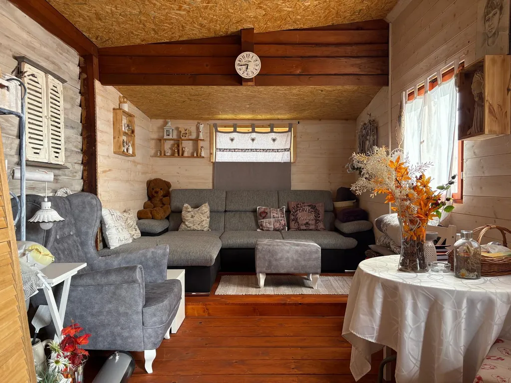 Součástí je také zastřešená pergola o velikosti cca 4 × 3 m, která vytváří příjemné zázemí pro posezení, odpočinek i setkávání s rodinou či přáteli. Chata je napojena na elektřinu i vodu, což výrazně zvyšuje komfort užívání. Toaleta je řešena samostatně na pozemku formou venkovní stavby, která však již disponuje klasickým WC napojeným do jímky.
