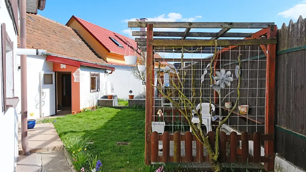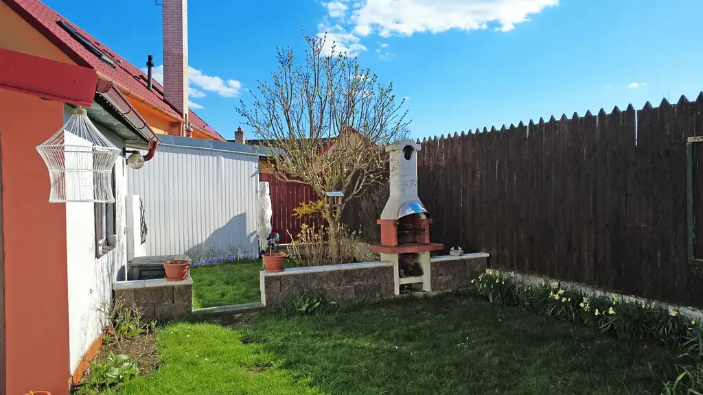 zahrada: posezení s pergolou, venkovní gril, sklad - komora, uzavřený dvůr - vysoký plot (úplné soukromí)