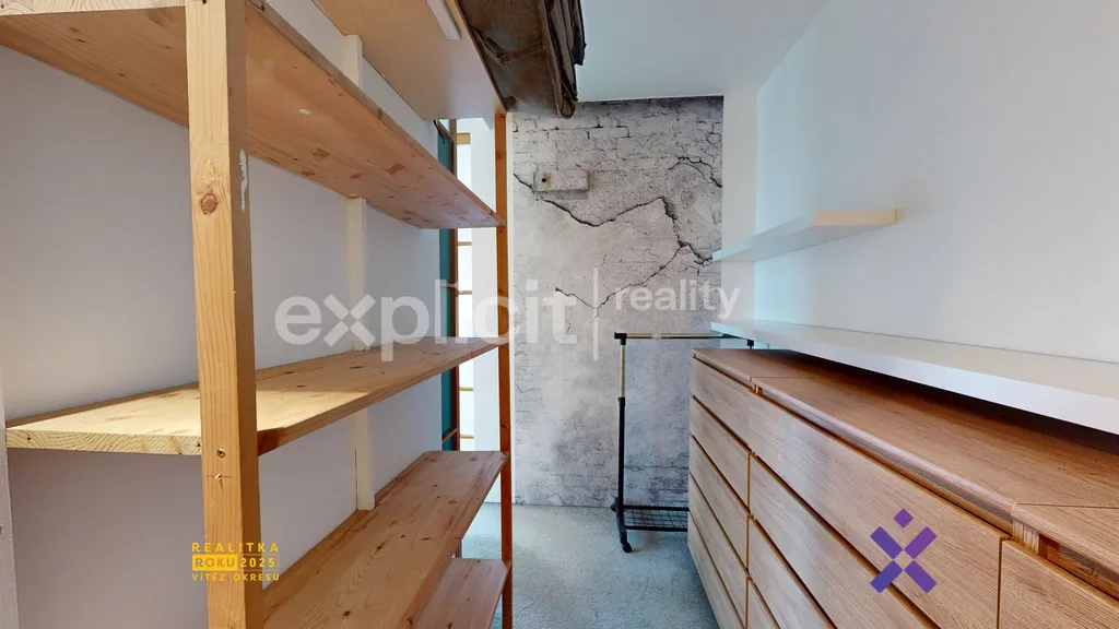 Elegantními posuvnými dveřmi v japonském stylu vstoupíte do ložnice s manželskou postelí a matracemi. Na ložnici navazuje prostorná šatna s komodami, regály a celkově velkorysým úložným prostorem.