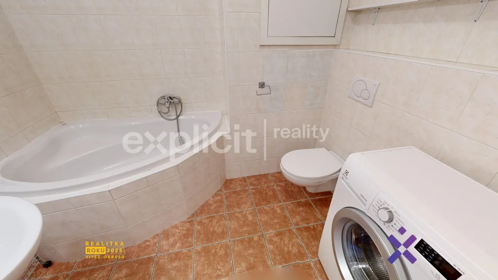 Koupelna disponuje velkou vanou, pračkou, topným žebříkem a skříňkou pod umyvadlem. Součástí koupelny je také toaleta.