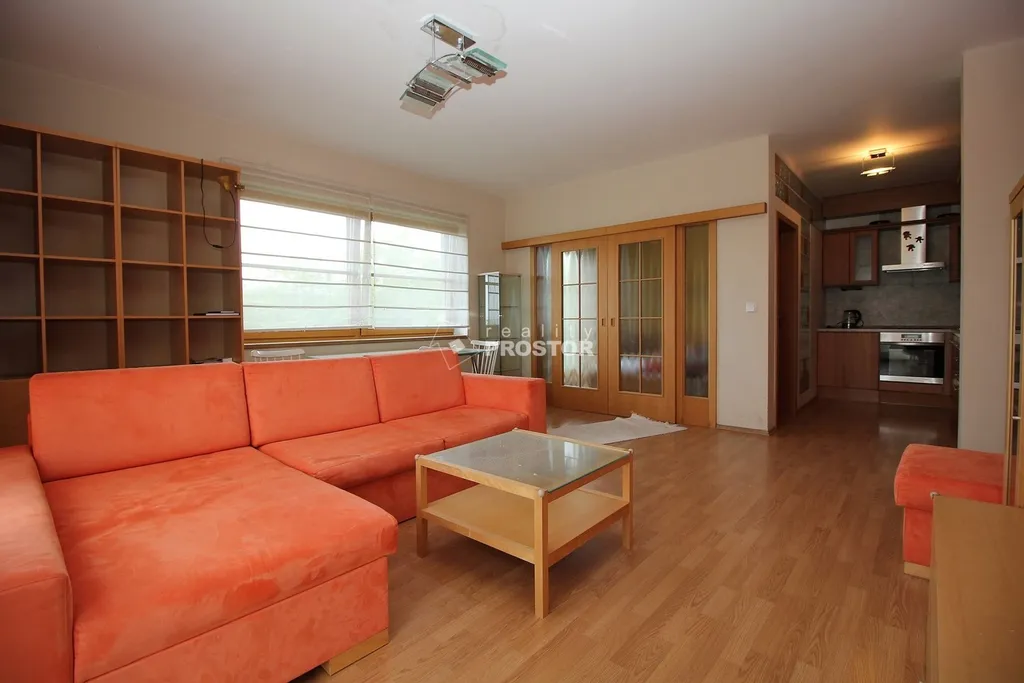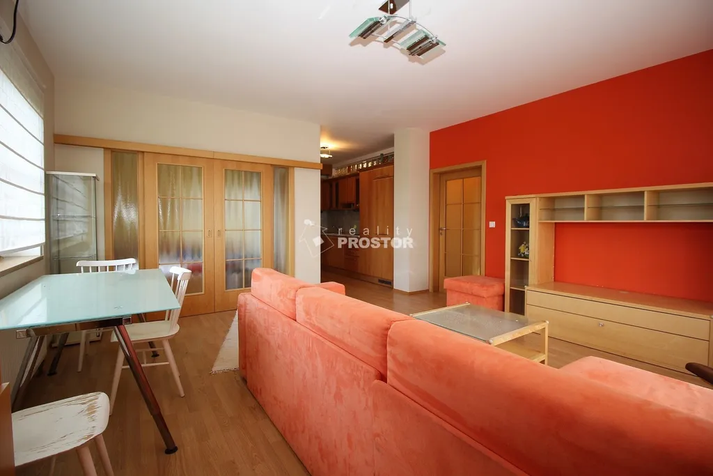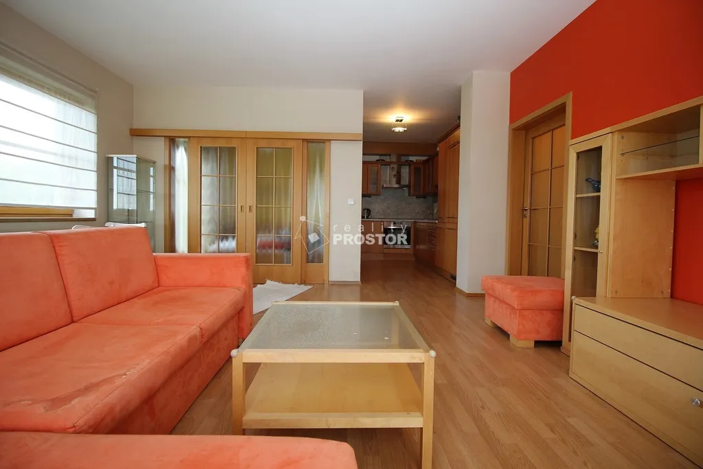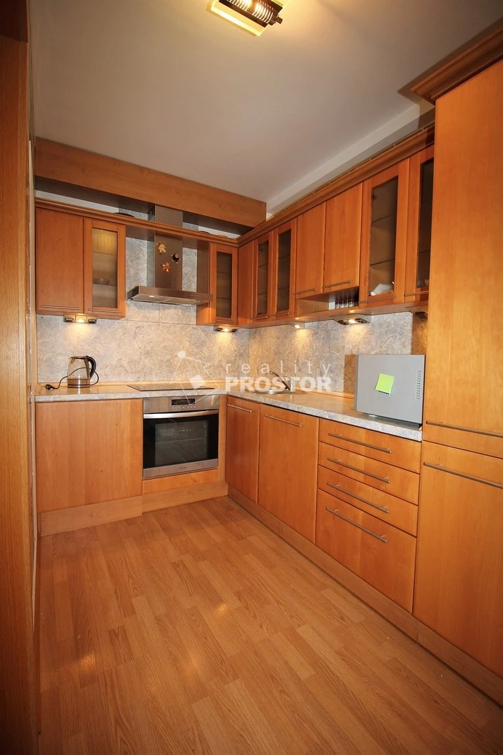 Dominantou bytu je prostorný obývací pokoj s kuchyňským koutem a přímým propojením s ostatními místnostmi. Kuchyňská linka je vybavena vestavěnými spotřebiči a nabízí dostatek pracovního i úložného prostoru.