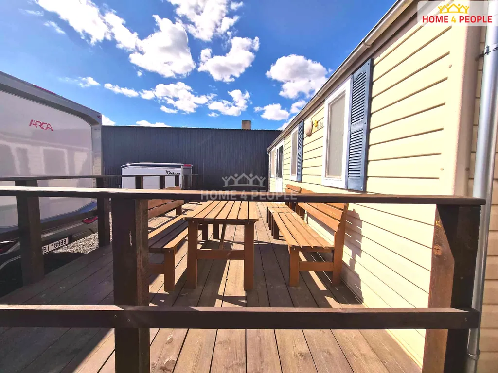 Díky velké terase získáte luxusní venkovní prostor, který u běžných mobilheimů často chybí. Dům je kompaktní, snadno se převáží a usazuje (kovová konstrukce,kola). Ev. číslo: 32149.