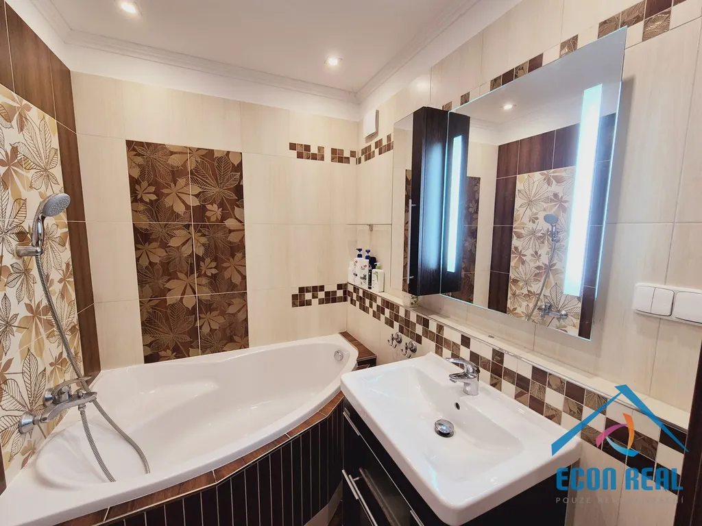 V koupelně se nachází rohová vana umyvadlo se skříňkou a topný žebřík, toaleta je samostatně. Byt má také samostatnou šatnu (komoru) přímo v bytě a v případě potřeby k užívání i sklepní kóji.