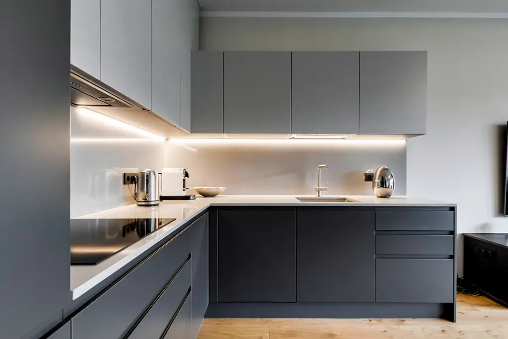 - Kuchyně: Špičková linka v matném tmavém dekoru s integrovanými spotřebiči a stylovým osvětlením.