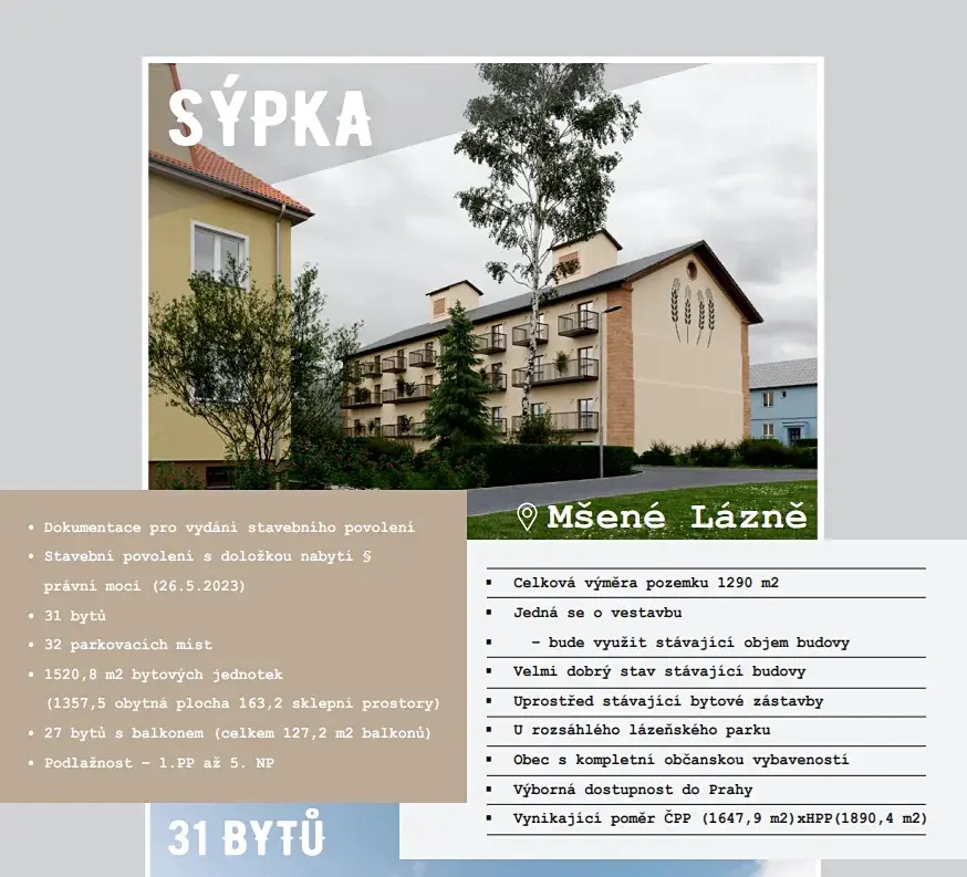 Jedná se o stavbu bývalého sila s platným stavebním povolením a s vyhotoveným projektem pro vestavbu 31 bytových jednotek a 32 parkovacích stání. Jedná se o vestavbu s tím, že bude využit stávající objem budovy. Samotná budova je nyní v dobrém technickém stavu.