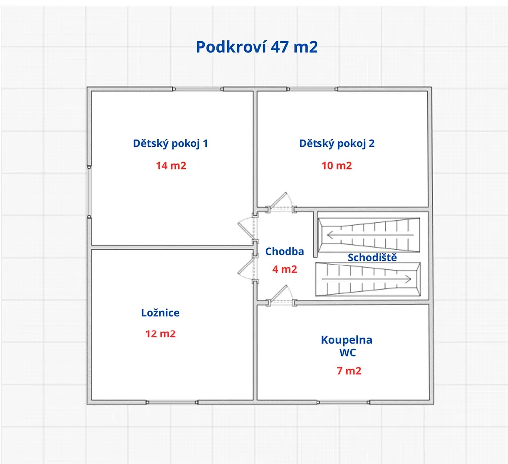 v podkroví se nachází 3 pokoje, další koupelna s WC a chodba se schodištěm.