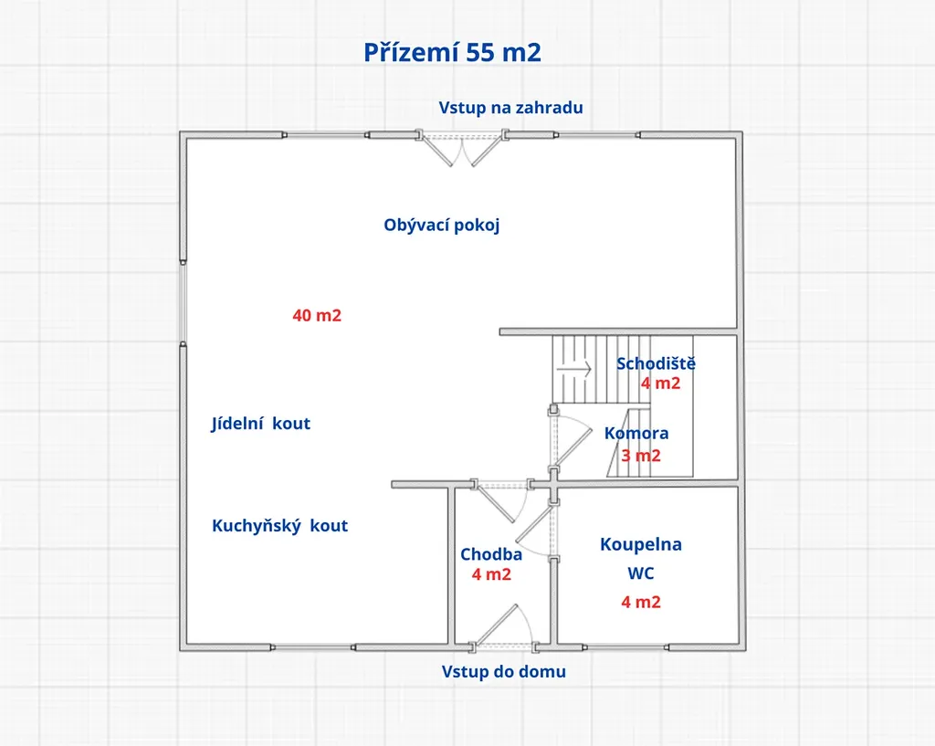 v přízemí z obývacího pokoje se vstupem na zahradu, kuchyňského a jídelního koutu, koupelny s WC, komory a vstupní chodby,