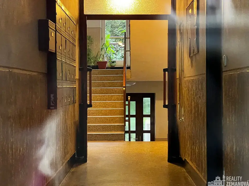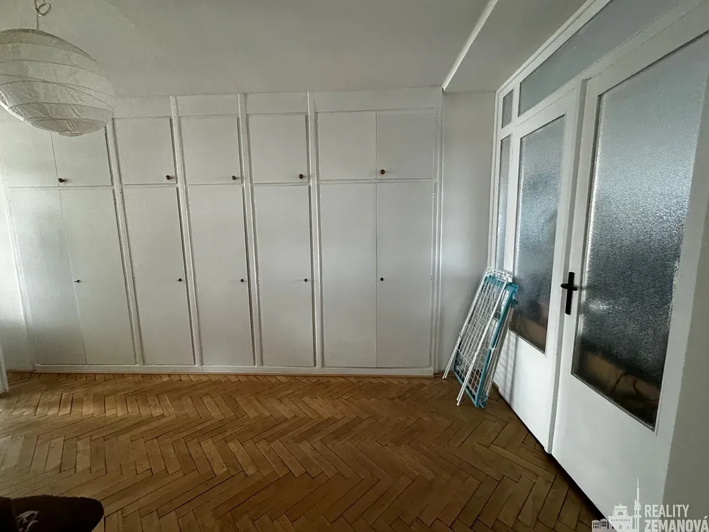 Světlý a prostorný byt v původním, ale udržovaném stavu s nachází v 5. patře s novým výtahem. Dispozice bytu: větší předsíň se vstupem do kuchyně, do komory, na WC/samostatné a bez dveří do velké společenské místnosti/haly bez oken se řadou vestavěných skříní. Z této místnosti se vstupuje do koupelny a do dvou protilehlých prostorných pokojů s orientací východní a západní, s volným výhledem. Kuchyň je vybavena linkou s novou vestavěnou myčkou, novým sporákem s el. troubou, lednicí s mrazákem a má vlastní spíž.