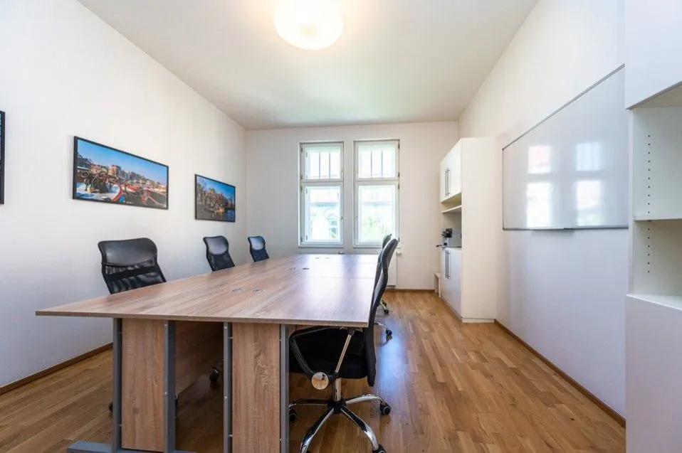 Celková podlahová plocha je 53,2 m2. Prostory tvoří dvě samostatné neprůchozí kanceláře přibližně stejné velikosti, z nichž v jedné se nachází rovněž menší kuchyňská linka, dále k dispozici je koupelna se sprchou, separátní toaleta a předsíň s úložnými prostory. Kancelář je zařízena kvalitním nábytkem: stoly, židle, skříně, sedačka - viz. foto u nabídky. Podlahy i okna jsou dřevěné, vstupní dveře bezpečnostní s vícebodovým uzamykáním. K dispozici je přípojka na vysokorychlostní internetové připojení.