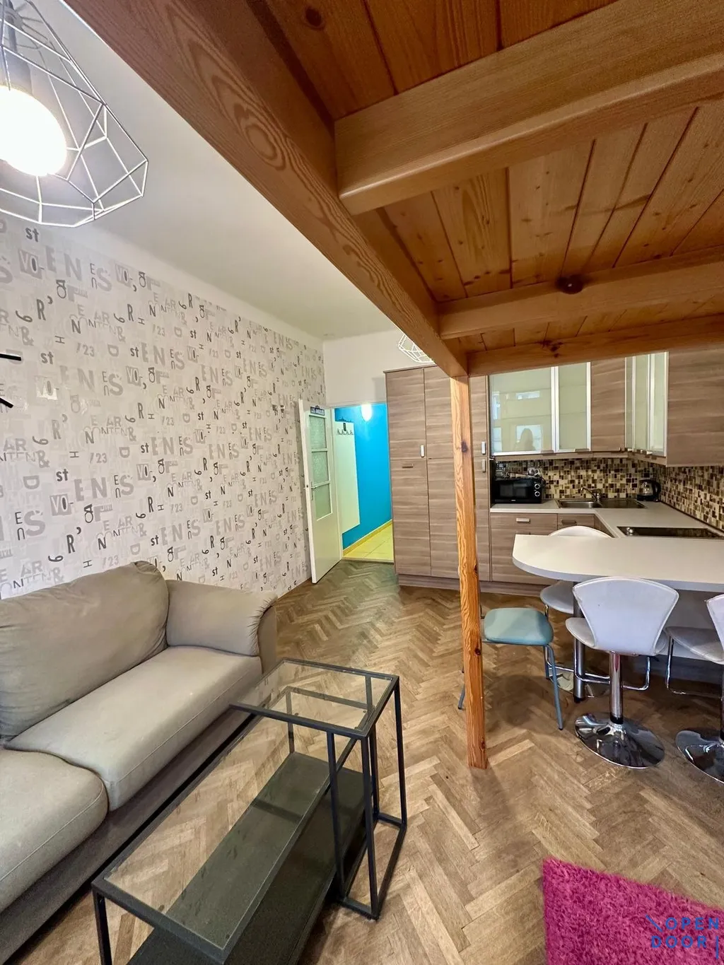 Byt prošel kompletní rekonstrukcí a nabízí se jako vybavený a zařízený. Z předsíně je po levé straně vstup do koupelny, která je se sprchovým koutem, toaletou a pračkou. Naproti vstupu do bytu je hlavní pokoj, který je rozdělen na kuchyňský kout vybavený lednicí s mrazákem, dvouplotýnkovým vařičem a mikrovlnnou troubou; a obývací část se spacím patrem s matrací, sedačkou a televizí. Byt nabízí dostatek úložných prostor. Na podlaze v pokoji jsou parkety, jinak dlažba.