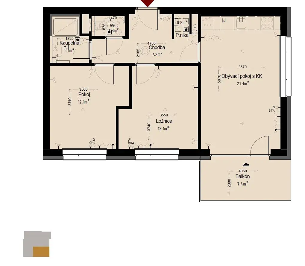 Nabízím k prodeji jeden z posledních bytů 3+kk s balkonem (7,4m2) o podlahové ploše 64,8m2 vč. příslušenství, které tvoří sklep (2,2 m2) umístěný v suterénu domu. Dispozice bytu: vstupní chodba, ložnice, dětský pokoj, koupelna, samostatné WC, obývací pokoj s kuchyňským koutem a vstupem na balkón. Tento byt jako jediný tohoto typu má praktický sprchový kout v koupelně. Je umístěný v 2.NP novostavby bytového domu A2, v severní věži. Byt o stejné dispozici vám mohu nabídnout ještě ve vedlejší jižní věži ve 3.NP.