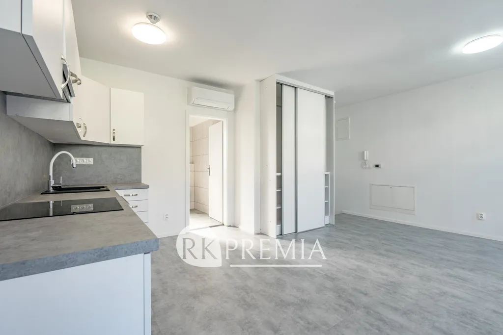 Moderní kuchyňská linka je vybavena elektrickou troubou, indukční varnou deskou, odsavačem par a vestavěnou myčkou.