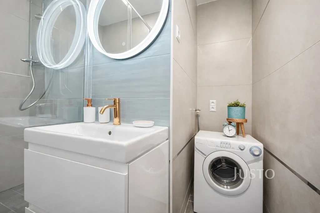 • koupelna se sprchovým koutem, vestavěným umyvadlem ve skříňce a pračkou,