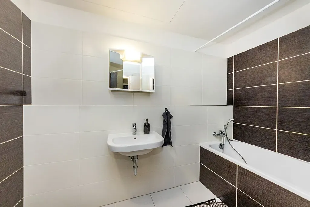 Bytová jednotka sestává z obývacího pokoje s kuchyňských koutem 25,2 m2, ložnice 15,3 m2, vstupní chodby 10,3 m2, koupelny 5,6 m2 a WC 1,8 m2.