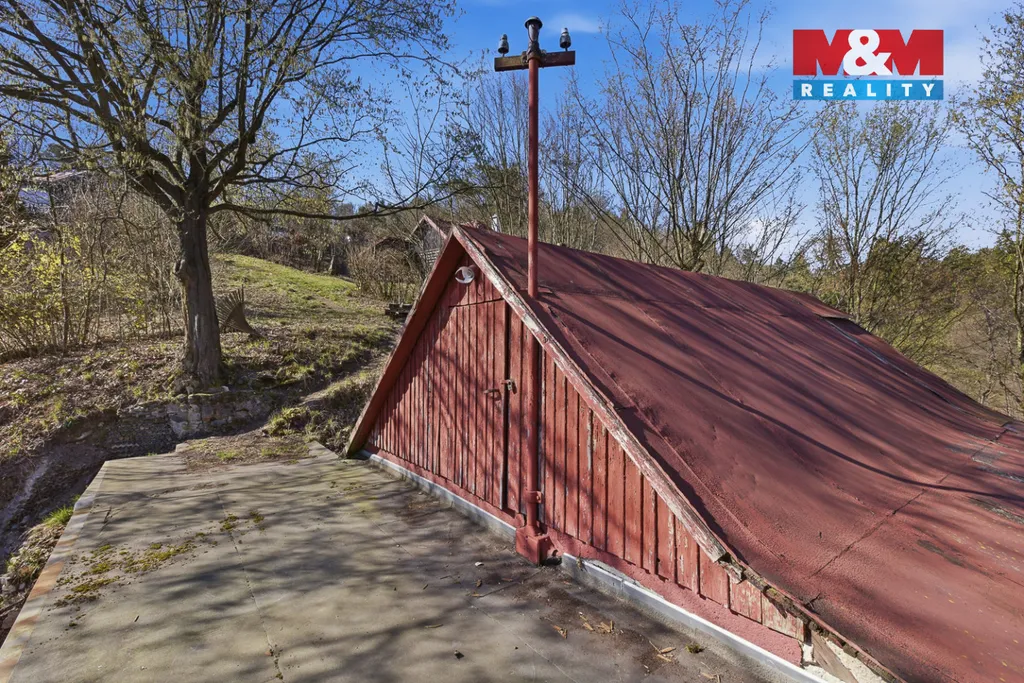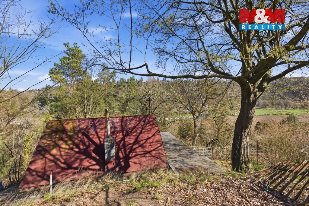Pozemek je svažitý, ale právě to je jeho největší výhoda – nabízí krásné výhledy do krajiny a na řeku Berounku, která je jen kousek od chaty.