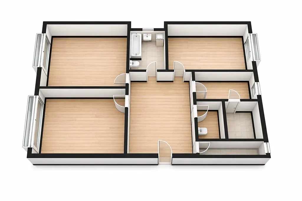 Na podlahách se nachází dřevěné parkety vhodné k renovaci. Okna bytu jsou orientována na jih, což zajišťuje dostatek denního světla po celý den. Část oken je na sever směrem do uzavřeného vnitrobloku, kde je k dispozici i společná zahrada. Okna jsou dřevěná, do ulice špaletová a do vnitrobloku euro okna. Kompletně vyměněny při rekonstrukci domu.
